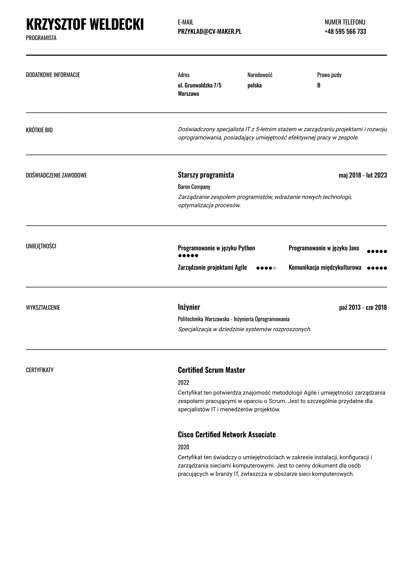Możesz uwzględnić sekcje takie jak certyfikaty, znajomość języków obcych, projekty, wolontariat czy zainteresowania. Upewnij się, że są one istotne dla stanowiska, o które się ubiegasz. Wzory CV bez zdjęcia często zawierają te dodatkowe sekcje. Dodatkowe sekcje mogą znacząco wzmocnić Twoje CV, pokazując dodatkowe umiejętności i doświadczenia, które mogą być wartościowe dla potencjalnego pracodawcy.