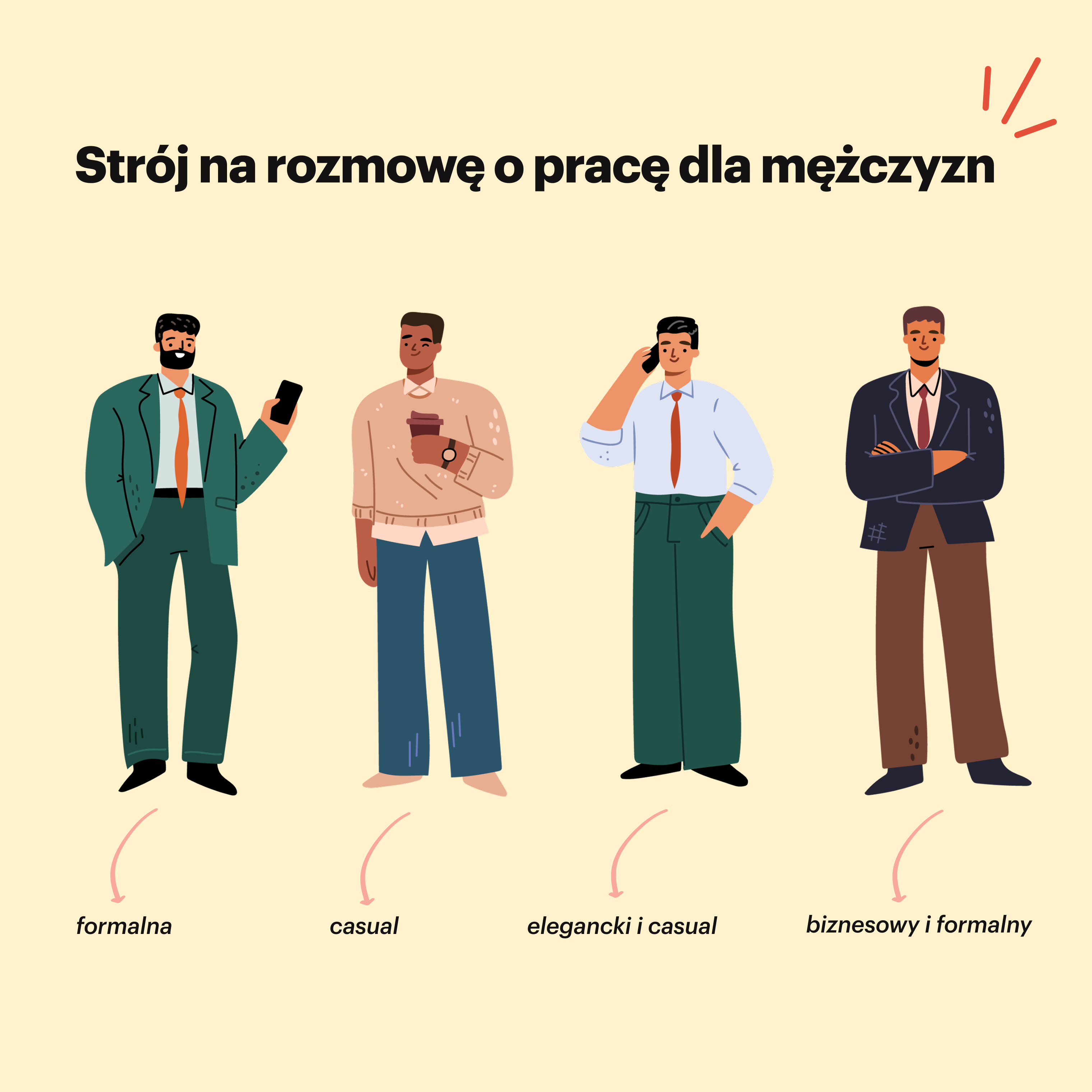 Ogólnie rzecz biorąc, w firmie masz dwa style odzieży: casual i business. Oba kody ubioru są dobrze znane wśród pracodawców i mają ponownie gradacje. Jeśli dress code jest swobodny, podczas pracy możesz nosić to, co chcesz. Z tym stylem ubioru można się spotkać na przykład w młodych kreatywnych firmach, lub coraz częściej w branży gastronomicznej. Pamiętaj jednak, że ubierając się na rozmowę o pracę, upewnij się, że wyglądasz nieskazitelnie. Kiedy dress code jest elegancki i swobodny, kultura firmy jest nieco bardziej formalna. Chinosy z elegancką kurtką naprawdę tu pasują. Otoczenie biznesowe i formalne, takie jak bank. Styl, który wybierzesz na rozmowę kwalifikacyjną, zależy nie tylko od kultury firmy, ale także od stanowiska i działu. Czy jest to praca menedżerska? Czy jest to praca, w której często masz kontakt z klientami? Wszyscy powinniście uwzględnić odpowiedzi na to pytanie w ostatecznym wyborze odzieży na rozmowę o pracę. Ale pamiętaj, lepiej ubierać się formalnie niż zbyt swobodnie.