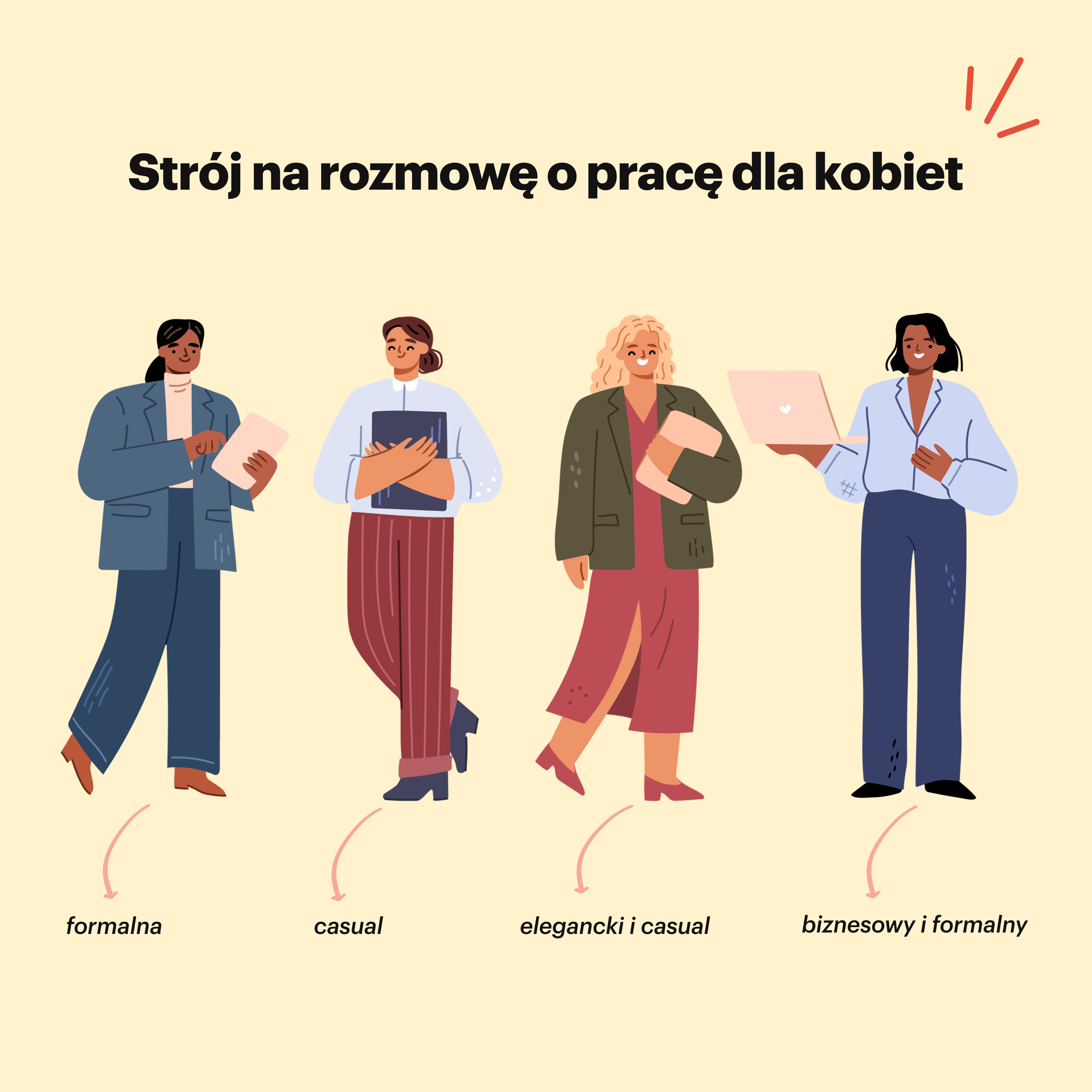 Ta zasada dotyczy zarówno mężczyzn, jaki i również kobiet, które wybierają się na rozmowę kwalifikacyjną. Jeśli chodzi o odzież, Panie mogą również założyć spódnicę lub sukienkę. Czy istnieje ściśle formalny dress code? Wtedy szybko pojawia się garnitur, ale zgrabne spodnie z bluzką też są bardzo dobre. Upewnij się, że bluzka jest dopasowana, bo to bardziej biznesowy model niż luźny. Czy na rozmowę kwalifikacyjną możesz wybrać nieco mniej formalny strój? Sukienka z marynarką jest więc bardzo dobra. Lub połącz spódnicę i bluzkę z kardiganem. Wybierasz sukienkę czy spódnicę? Upewnij się, że jest za kolano.