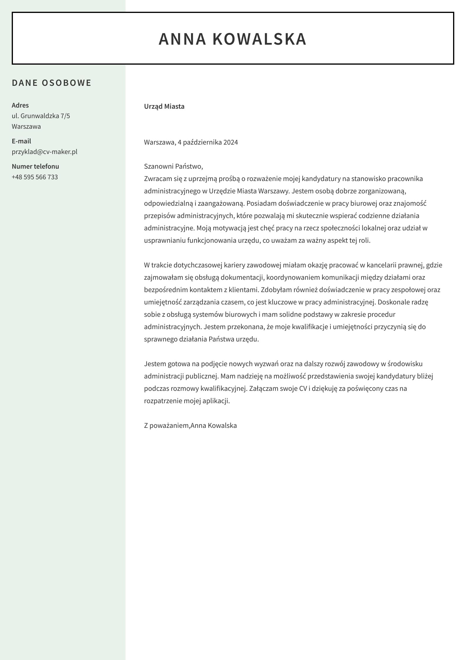 Zwracam się z uprzejmą prośbą o rozważenie mojej kandydatury na stanowisko pracownika administracyjnego w Urzędzie Miasta Warszawy. Jestem osobą dobrze zorganizowaną, odpowiedzialną i zaangażowaną, a moje doświadczenie w pracy biurowej oraz znajomość przepisów administracyjnych sprawiają, że jestem przekonana, iż spełnię oczekiwania stawiane przed pracownikiem urzędu. Moją motywacją jest możliwość pracy na rzecz społeczności lokalnej oraz udział w procesie usprawniania działania administracji publicznej.