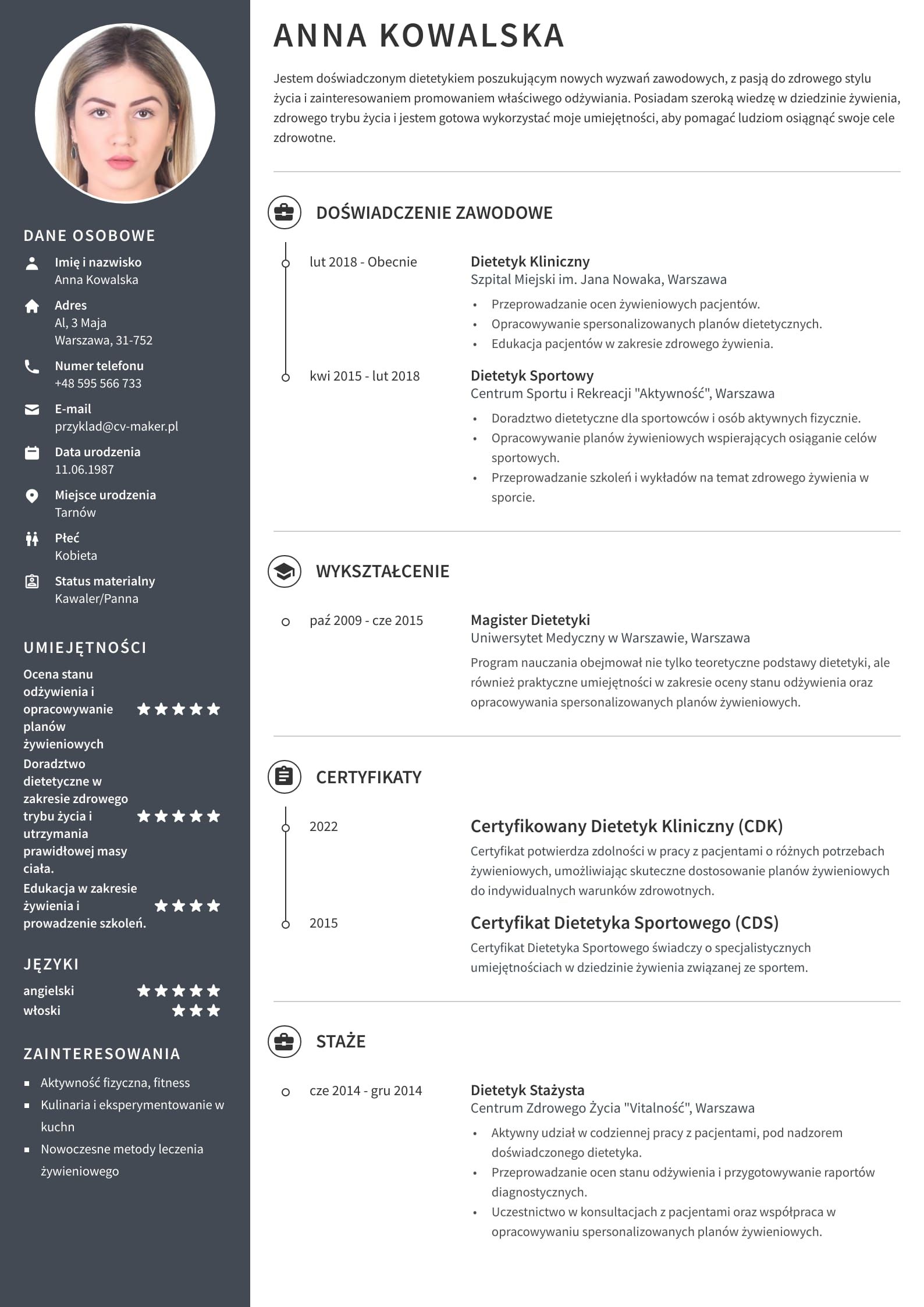 Wymienione zainteresowania i pasje, takie jak aktywność fizyczna, kulinaria i nowoczesne metody leczenia żywieniowego, dodają CV osobistego charakteru, pomagając w budowaniu pozytywnego wizerunku Anny jako zaangażowanej i zmotywowanej specjalistki. Poprzez te elementy Anna stworzyła spójny obraz swojego profesjonalizmu, elastyczności w podejściu do pracy i zainteresowań, które przynoszą dodatkową wartość w roli dietetyka.